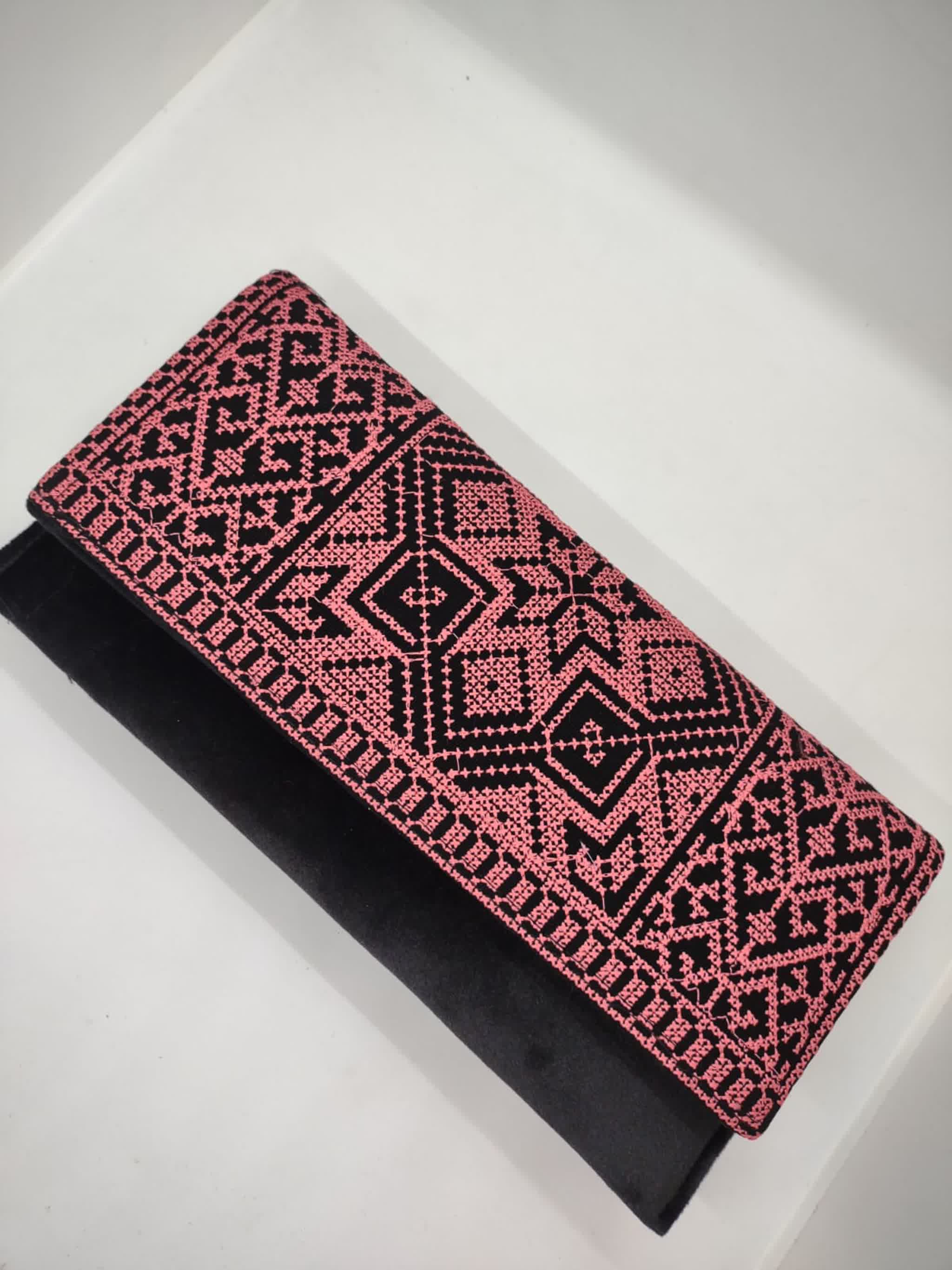 حقيبة كلاتش أنيقة مطرزة بتطريز فلسطيني بأجمل الألوان، تغلق بزر مغناطيسي ومقسمة من الداخل لجيبين، مع جيب خارجي بسحاب