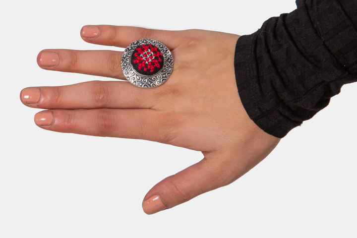 خاتم دائري الشكل مطرز يدويا بكل حب واتقان بأجمل النقشات الفلسطينية لترتديه بأهم مناسباتك فلن يخذلك أبداً