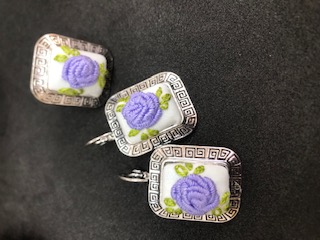 طقم خاتم وحلق مربع فضي بتطريز فلاحي بأجمل النقشات الفلسطينية على شكل ورود بنفسجية اللون