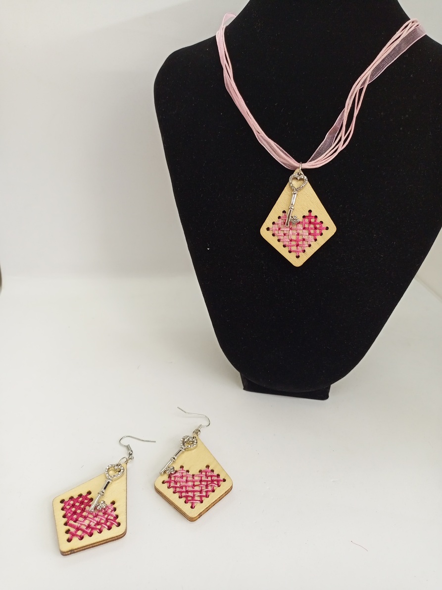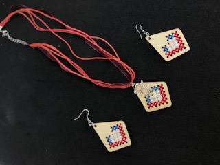 طقم من حلق وعقد يأتي بميداليات خشب بالتطريز الفلسطيني بدقة وجودة عالية وبألوان زاهية.