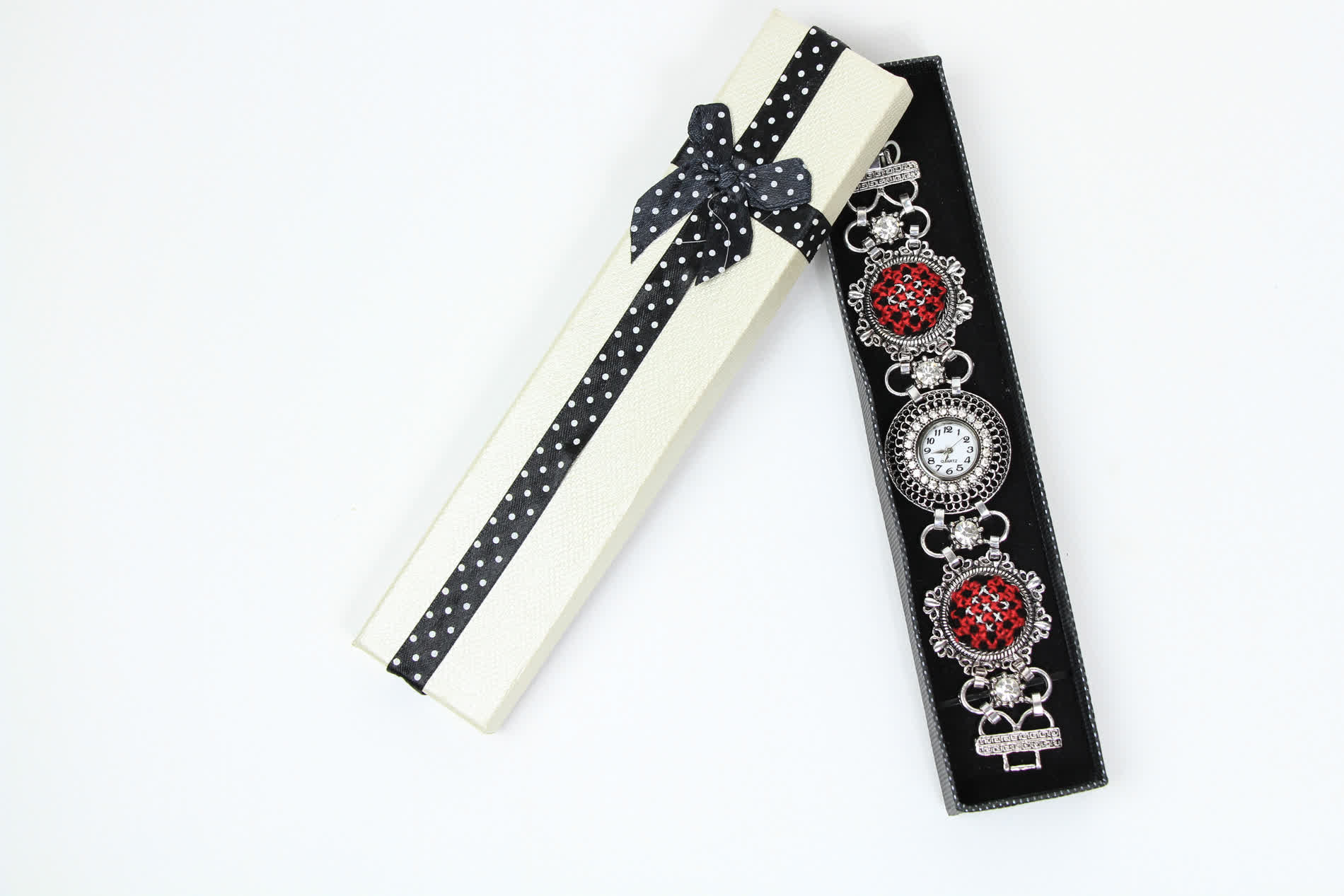 ساعة فخمة من الأنتيك الفضي مطرزة يدوياً بأنامل فلسطينية بخيط dmc باللونين الأحمر والفضي الجذاب.