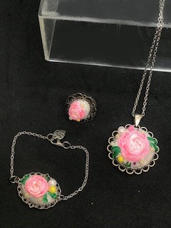طقم مميز من صنع احدى الفتيات المبدعات مطرز يدوياً بتطريز برازيلي يتكون من عقد من سلسلة وقلادة انتيك مطرزة مع اسوارة تتوسطها حلقة مطرزة بالتطريز المميز ذاته وحلق من الخرز الكريستالي
