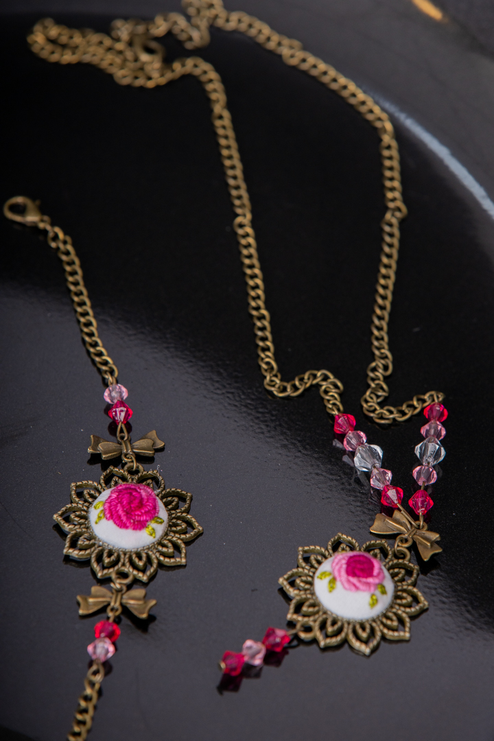 طقم مميز من صنع احدى الفتيات المبدعات مطرز يدوياً بتطريز برازيلي يتكون من عقد من سلسلة وقلادة انتيك مطرزة مع اسوارة تتوسطها حلقة مطرزة بالتطريز المميز ذاته