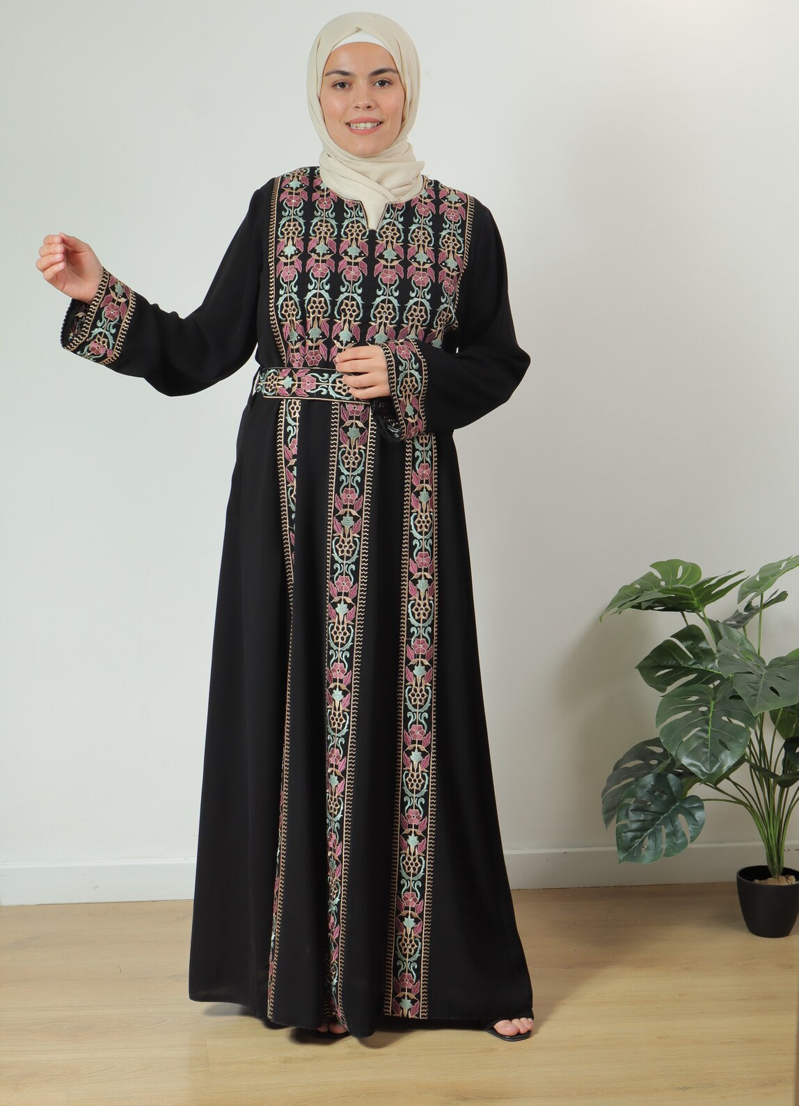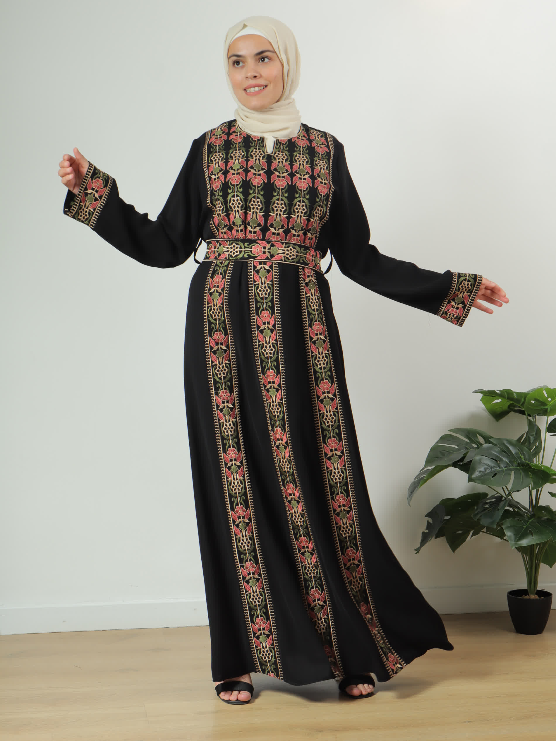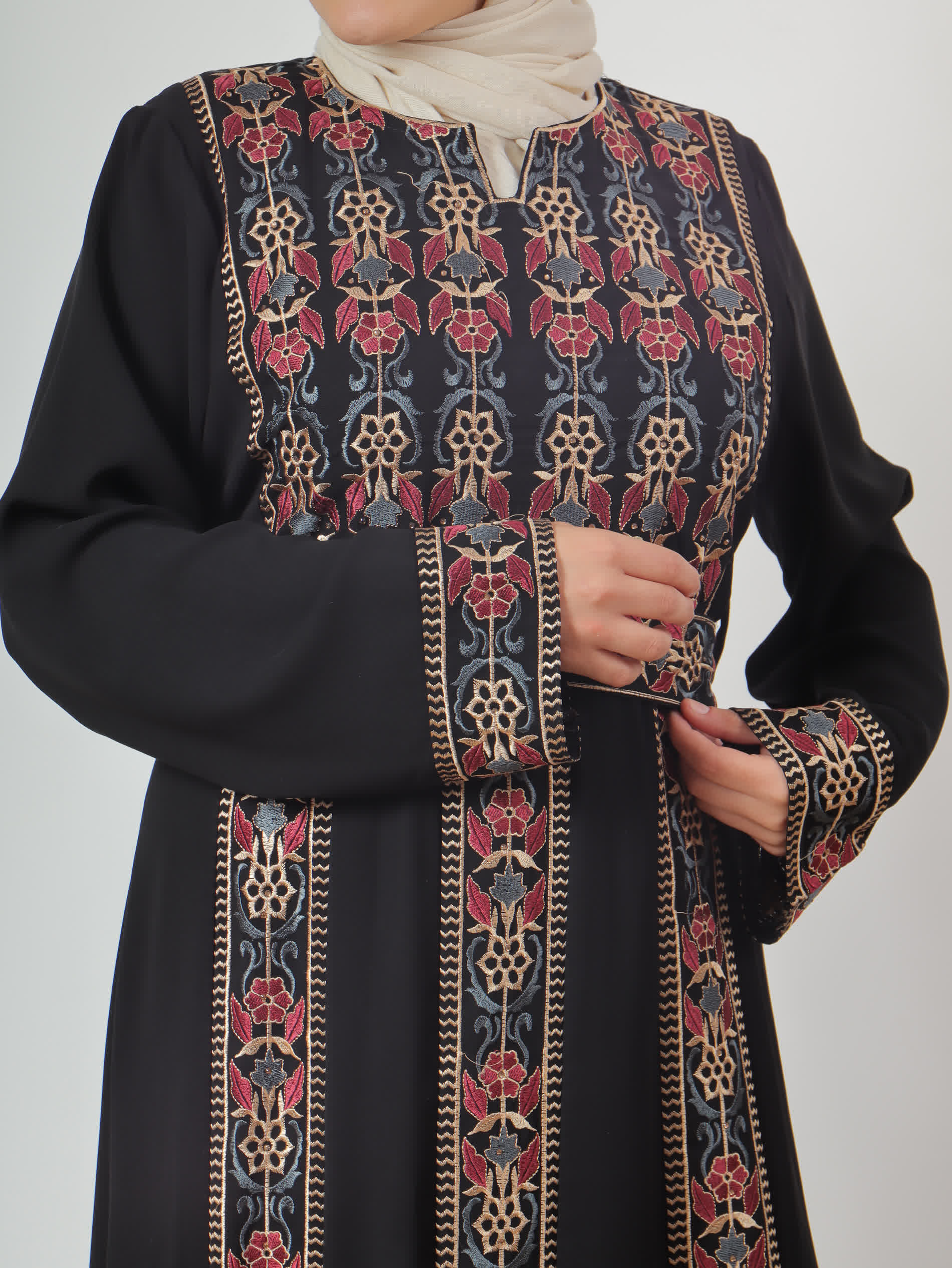 ثوب اكليل مطرز بنظام ثلاث عروق بتطريز براتو مميز وأنيق يجلب معه نفحات من التراث العريق، مع أكمام طويلة مطرزة بنفس التطريز من الحواف