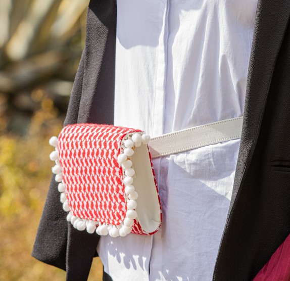 حقيبة خصر الشماغ الأردني مصنوعة من خامة عالية الجودة من الجلد، يزينها قماش الشماغ الأردني، مع كرات من الهدب الأبيض تحيط بالحقيبة