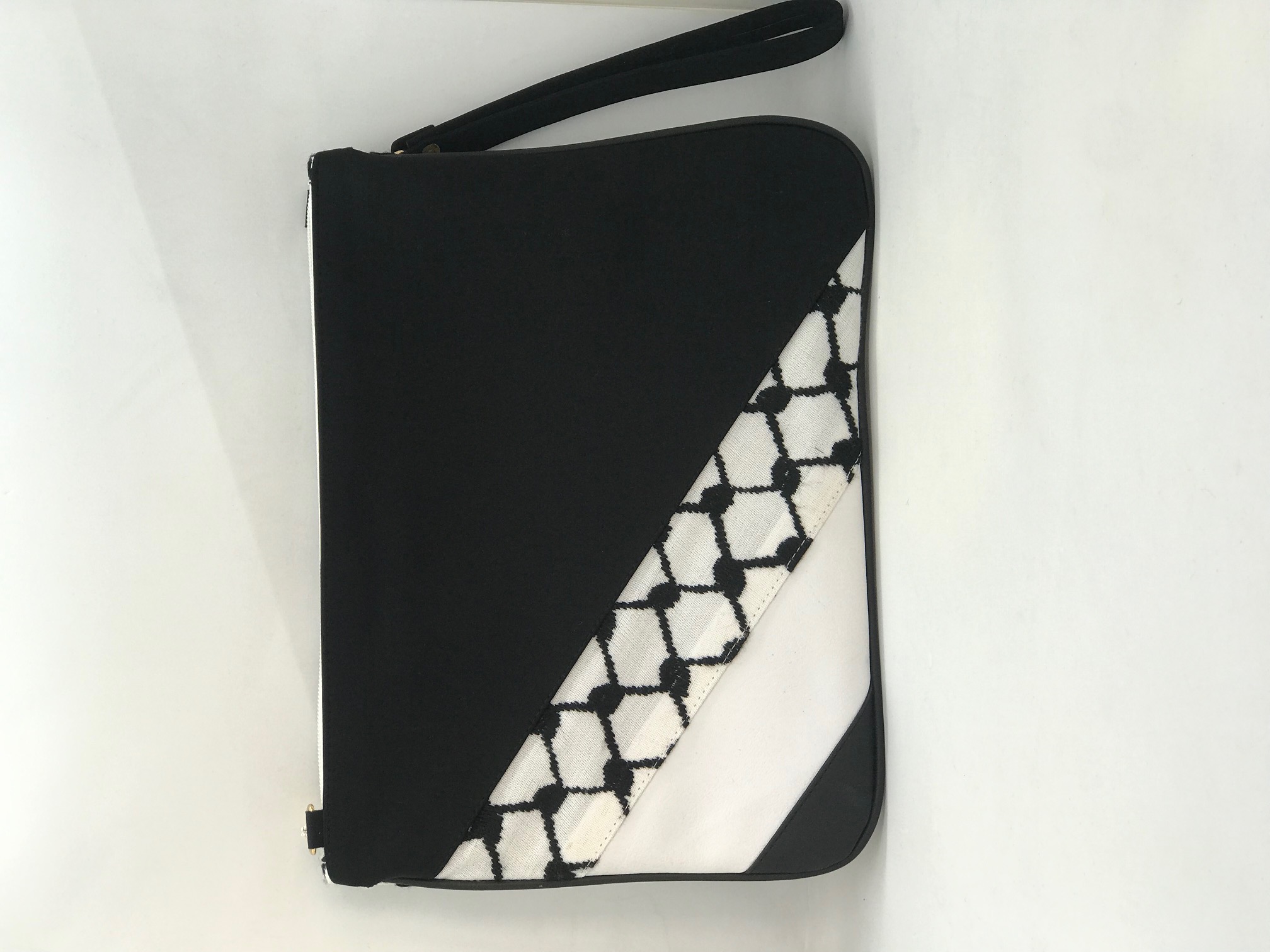 حقيبة كلاتش كبيرة تلبس على الوجهين بوجه من قماش الحطة الفلسطينية، والوجه الآخر من الستان، يتداخل معه مثلثات على الزاوية من الجلد الاسود والابيض وقماش الحطة الفلسطينية