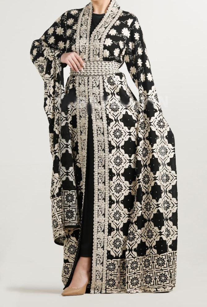 قفطان الأميرة مطرز بالتطريز الأغباني العريق، بـأجمل النقشات والرسومات باللون الذهبي، بخيط الحرير، مزين بحبات اللولو التي تزيد جماله وأناقته