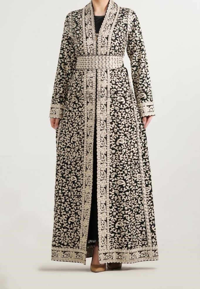 قفطان ياسمين مطرز بالتطريز الأغباني العريق، بـأجمل النقشات والرسومات باللون الذهبي، بخيط الحرير، مزين بحبات اللولو التي تزيد جماله وأناقته