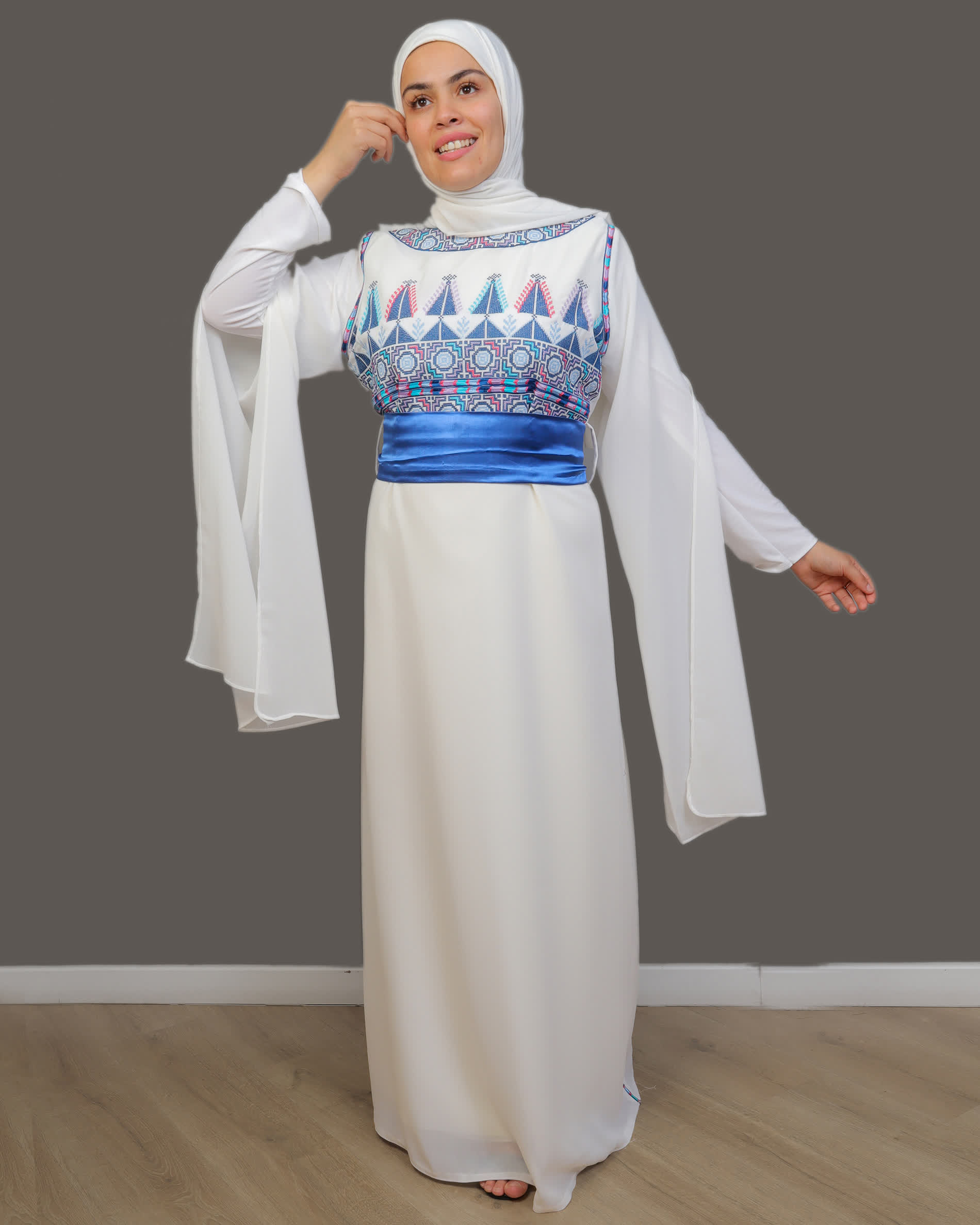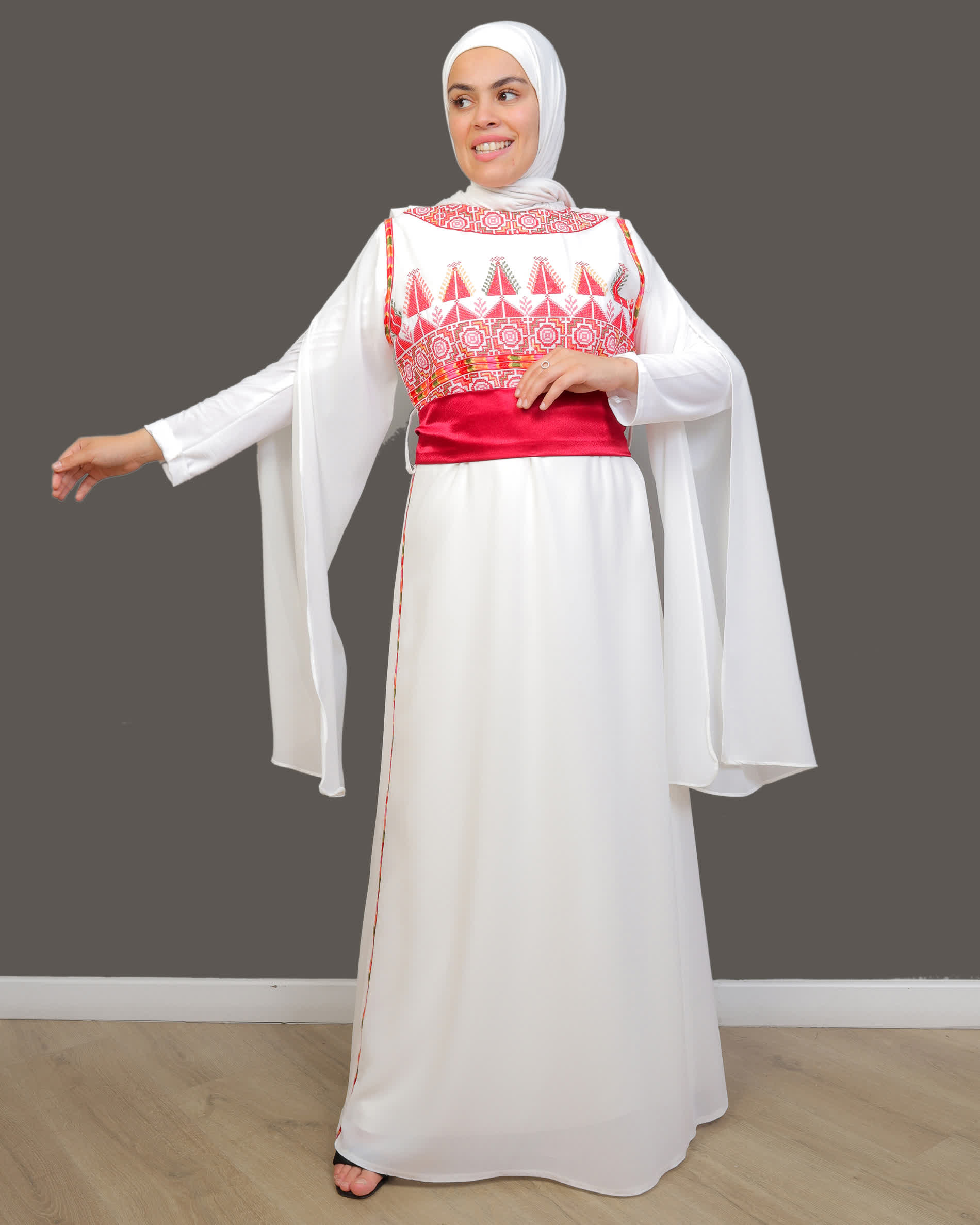 فستان راية بتصميم عرايس بديع مطرز بأجمل النقشات الفلسطينية على الصدر، مع حزام على شكل شبرة، بأكمام مفتوحة من المنتصف