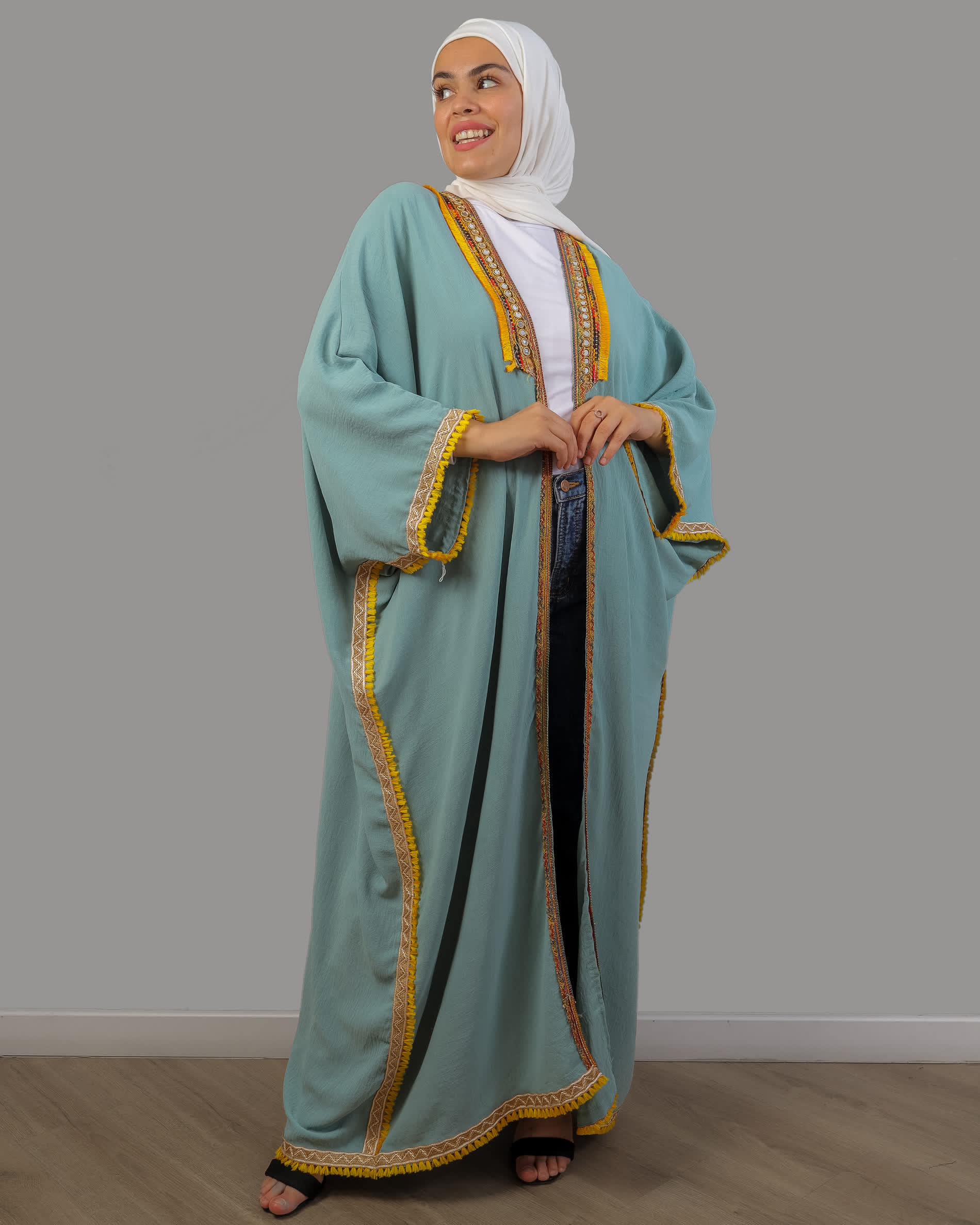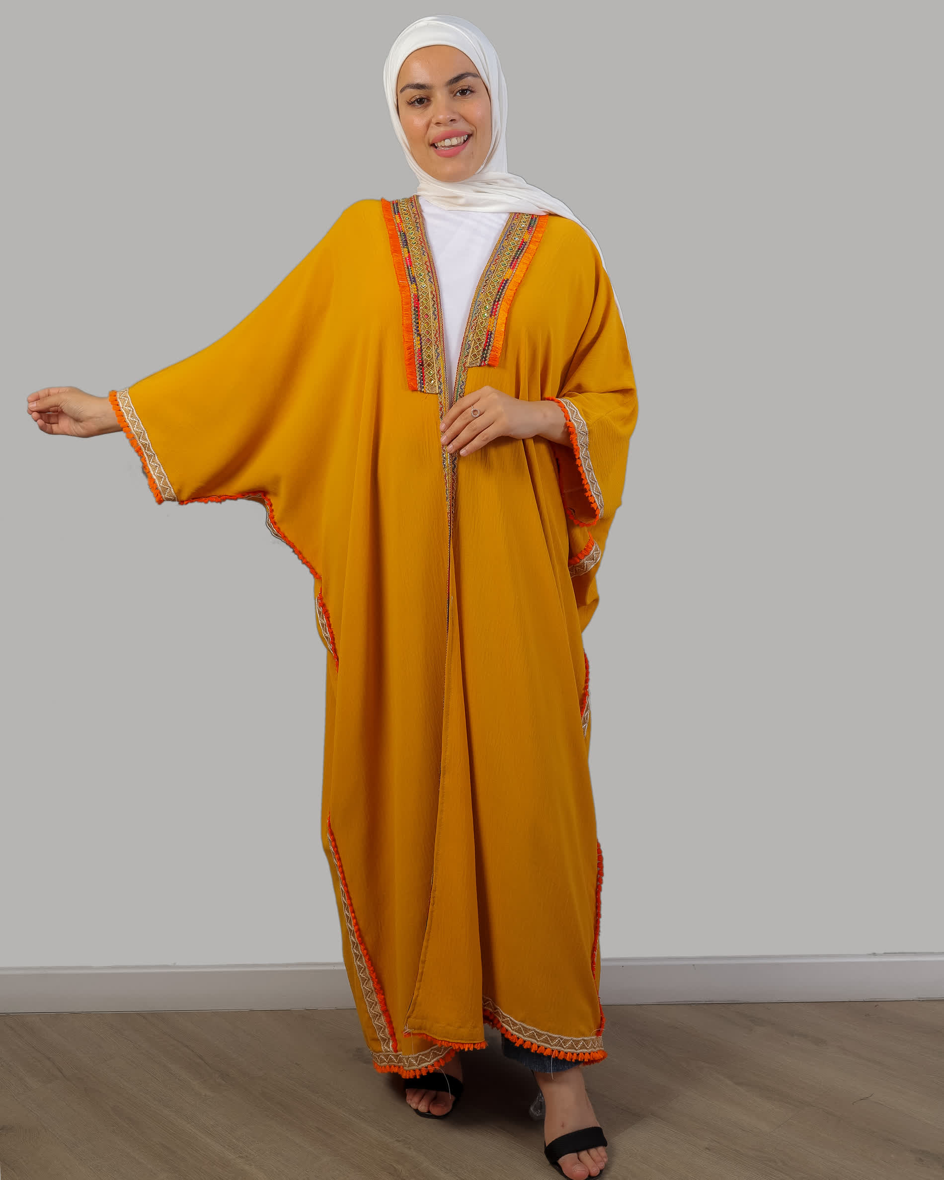 عباية مفتوحة من قماش السي واي كريب بقصة فضفاضة تناسب حتى وزن 110 كم باكمام فراشة ومزينة بشراشيب على الجوانب