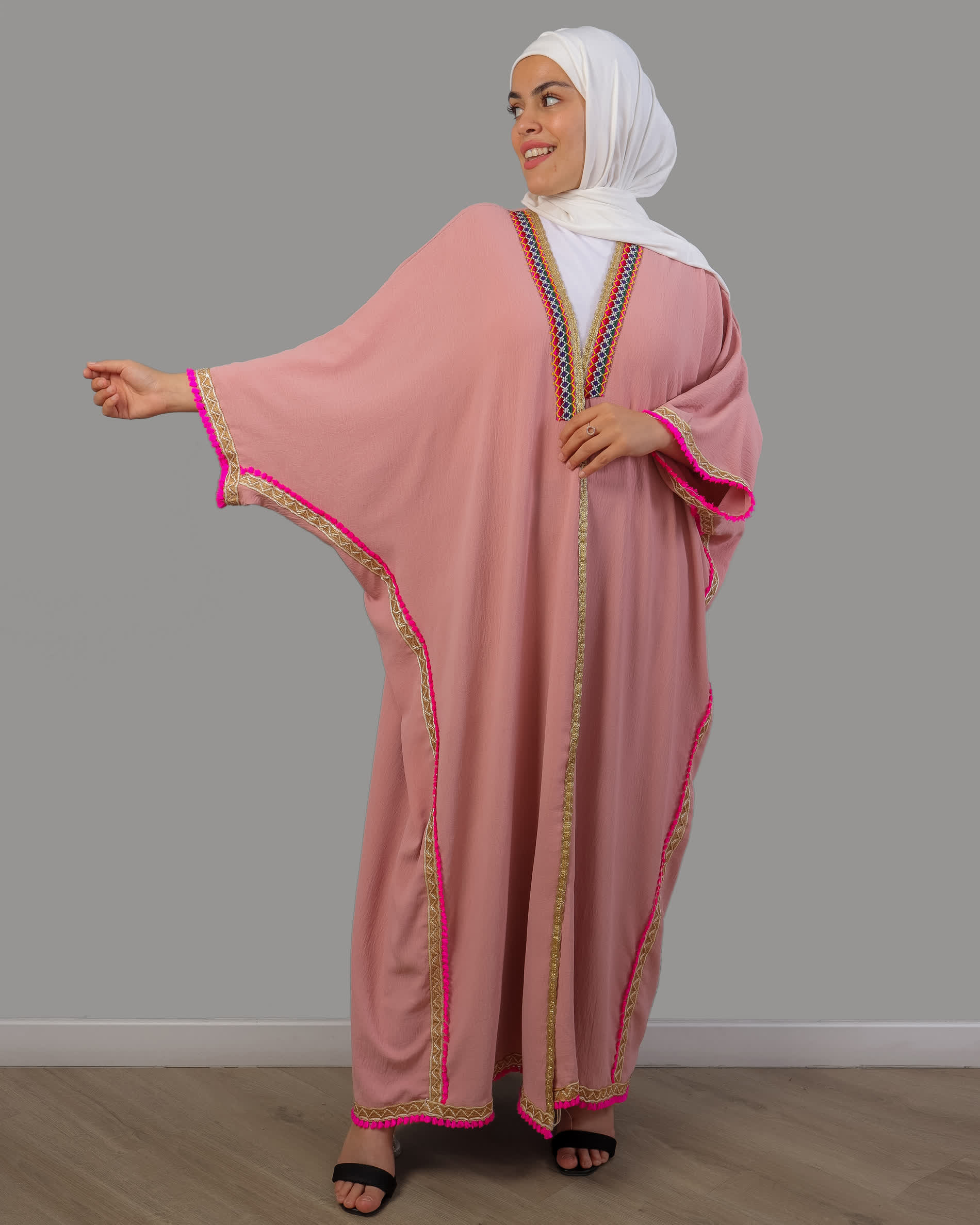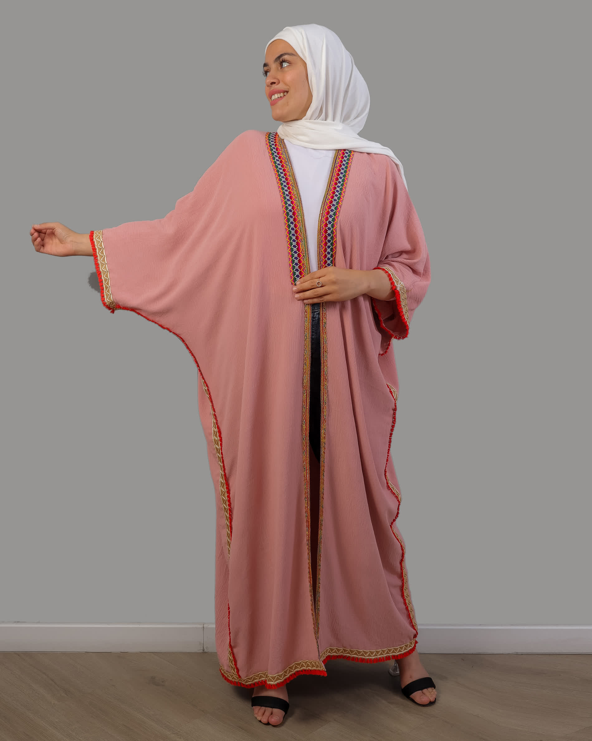 عباية جيداء مصنوعة من خامة عالية الجودة من قماش السي واي كريب، مفتوح بالكامل مع أكمام قصة فراشة، مشغول بخيوط القصب الذهبي من الأمام ومن الجوانب، ومطرز من منطقة الصدر بتطريز ناعم، مع شراشيب بألوان صيفية على الجوانب.